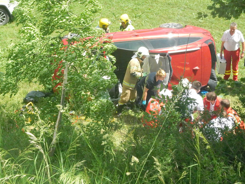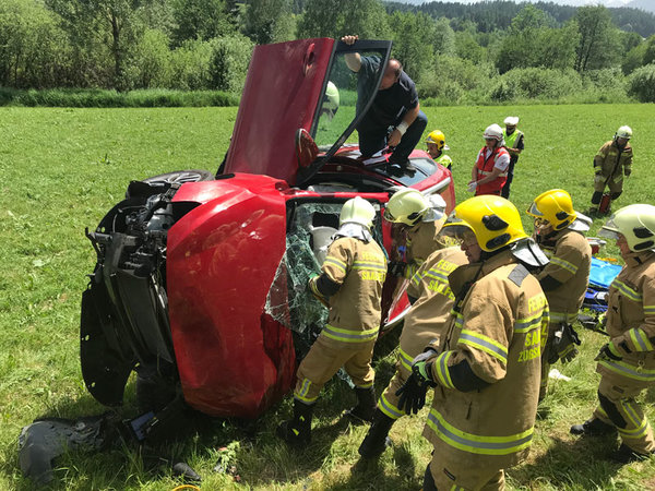 Ein PKW kam von der Straße ab und blieb seitlich liegen - die ersten Kräfte stabilisierten den PKW und öffneten das Dach mit dem hydraulischen Rettungsgerät.