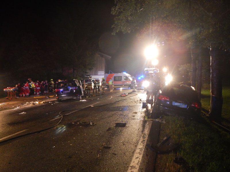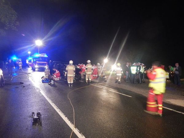 Verkehrsunfall mit drei beteiligten Fahrzeugen und 11 verletzten Personen, wobei keine Personen in den Fahrzeugen eingeklemmt waren.