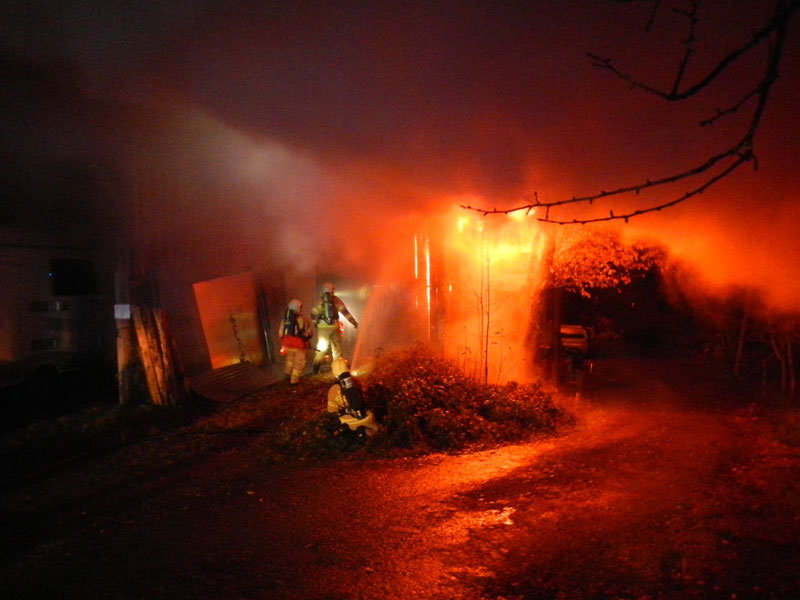 Danach konnten mehrere Atemschutztrupps die brennenden Fahrzeuge mit Schaum löschen. Durch die Atemschutztrupps wurden mehrere Gasflaschen aus dem brennenden Gebäude gebracht.