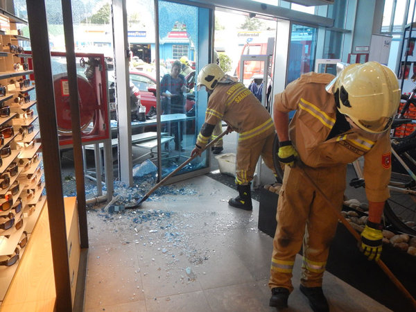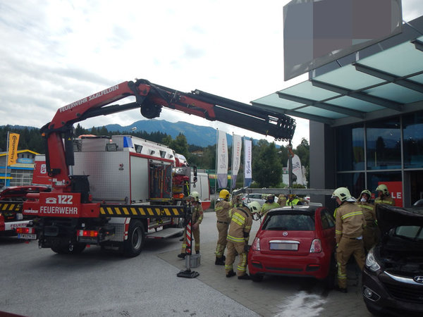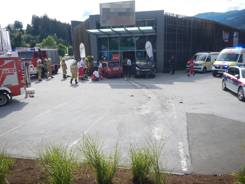 Verkehrsunfall zwischen zwei PKW, wobei ein PKW von der Fahrbahn abgekommen ist und anschließend mit einem geparkten PKW in den Eingangsbereich eines Geschäftsobjektes geschleudert wurde. Es waren keine Personen eingeklemmt, jedoch wurde eine Person verletzt. Vom Feuerwehrarzt erfolgte die Erstversorgung und weiters führte die Feuerwehr die Aufräumarbeiten durch und unterstützte das Abschleppunternehmen mittels Kran des SRF-A bei der Bergung der Fahrzeuge.