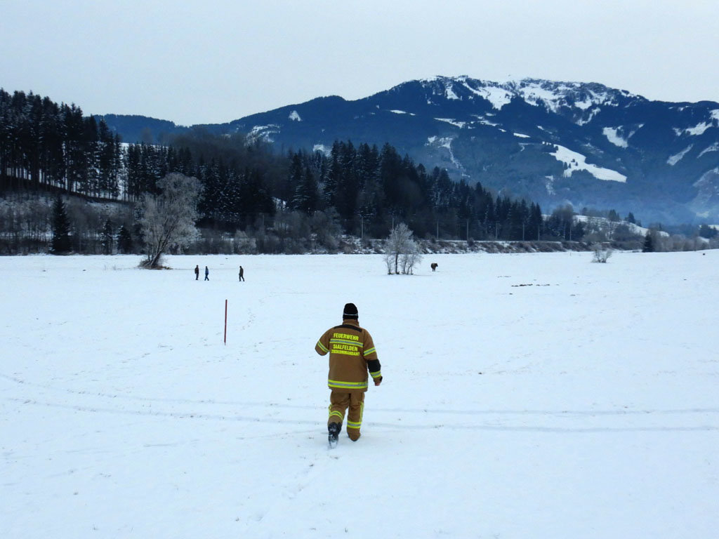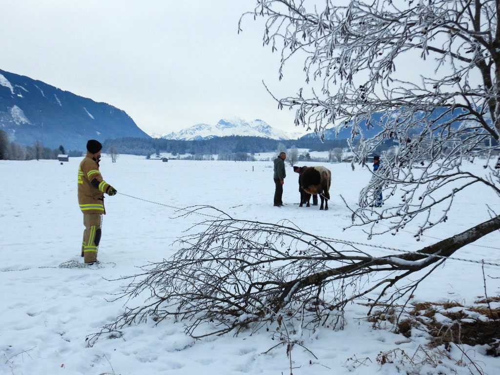 Die Feuerwehr Saalfelden wurde am 12.01.2021 um 11:09 Uhr von der Polizei zur Unterstützung für den Abtransport einer entlaufenen Kuh im Bereich Gehweg Haid alarmiert.