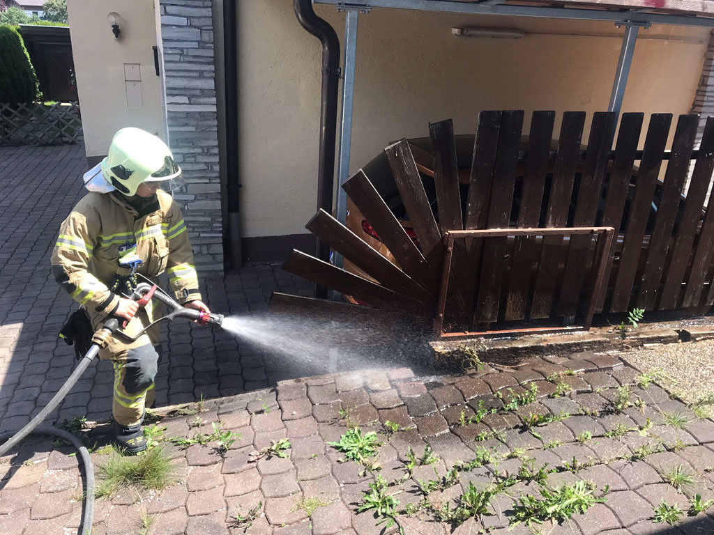 Der Einsatzleiter konnte einen Kleinbrand beim Gartenzaun feststellen - der Bereich wurde geöffnet und mit einem HD-Rohr gelöscht.