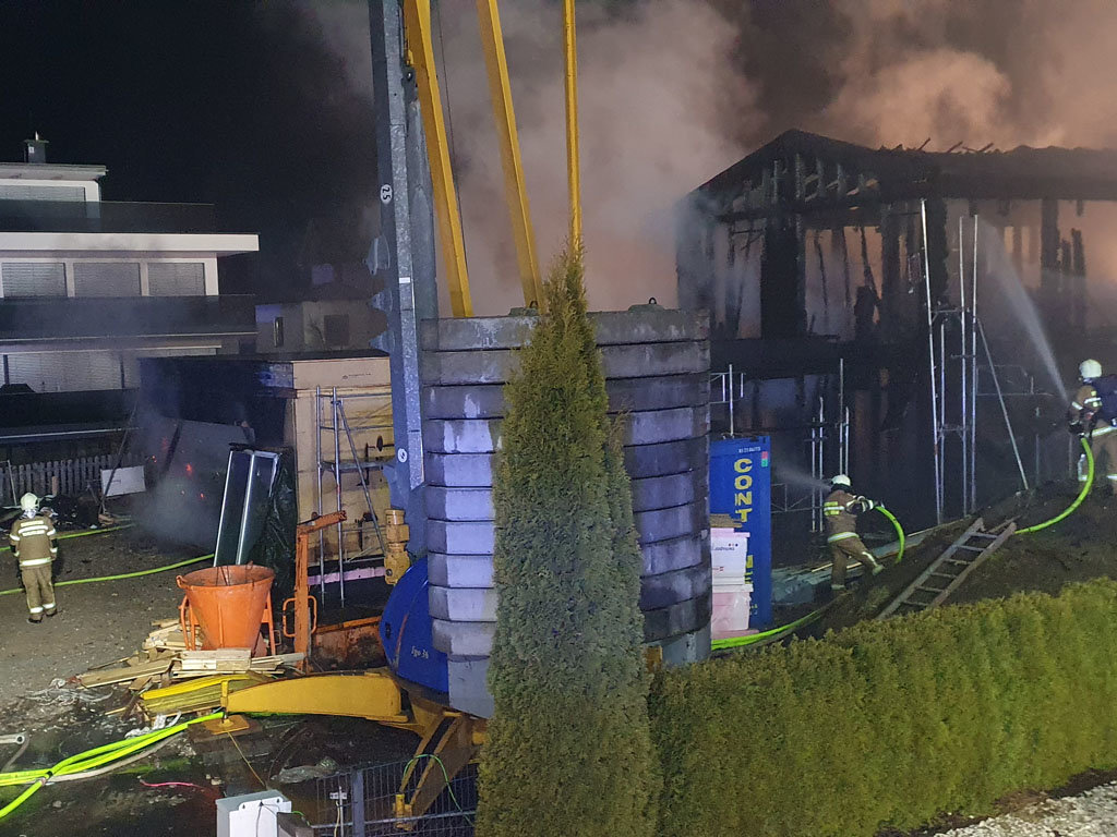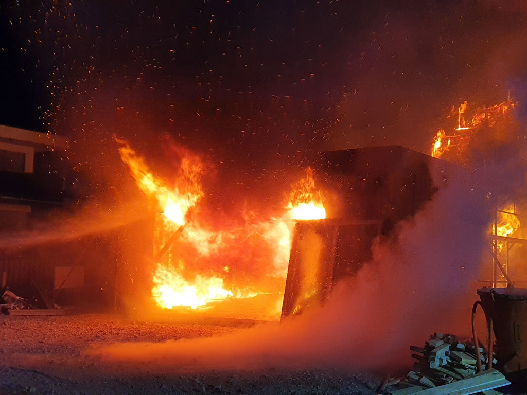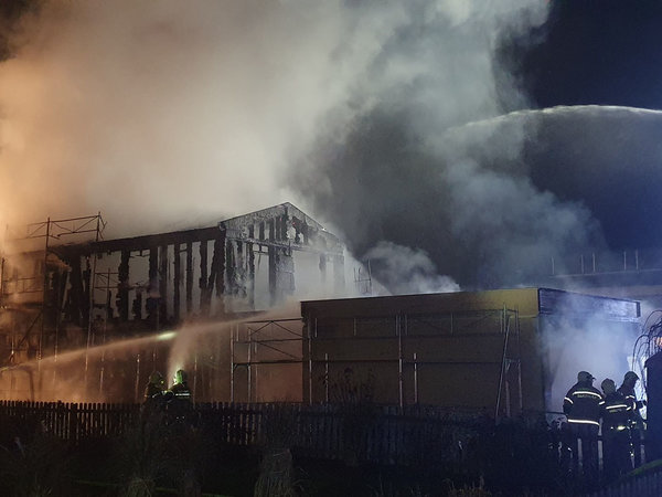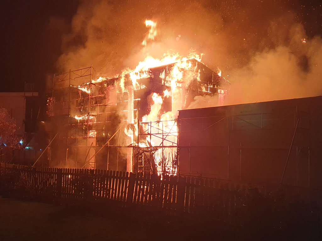 Mit zwei Werfern und mehreren Strahlrohren sowie der Drehleiter gelang es die Nachbarobjekte zu retten und den Brand zu löschen. Eine Brandwache wird bis in die Morgenstunden eingerichtet.