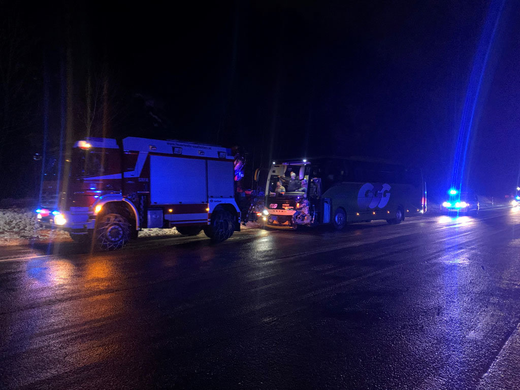 Verkehrsunfall auf der sehr stark vereisten Fahrbahn mit insgesamt vier Fahrzeugen (1x vollbesetzter Reisebus, 1x LKW, 2x PKW) und vorerst unklarer Lage.