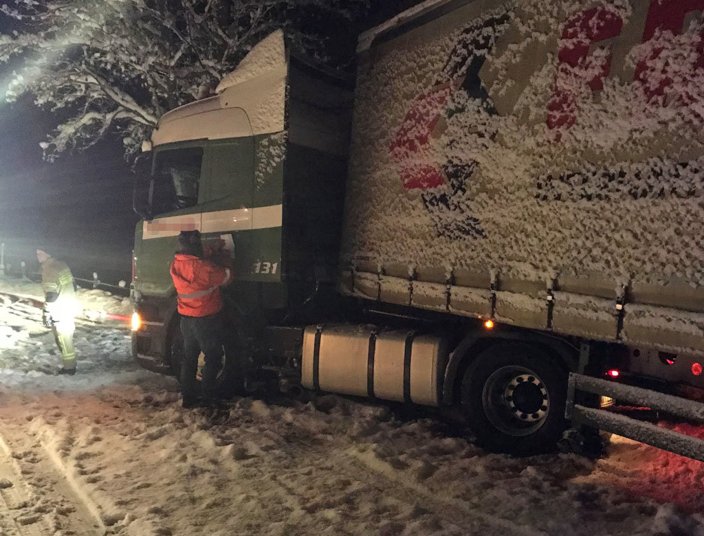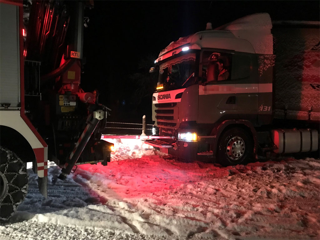 Ein LKW ist auf einem verschneiten Parkplatz hängen geblieben und wurde mit Hilfe des schweren Rüstfahrzeuges aus dem Parkplatz geschleppt.