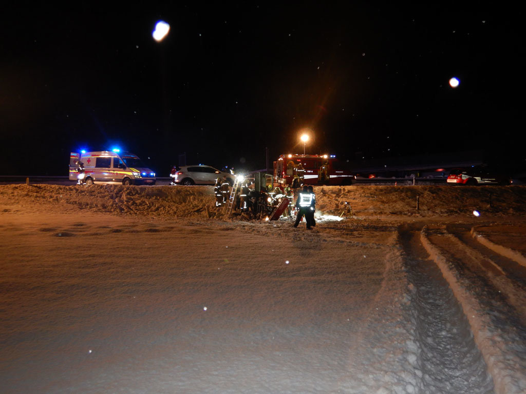 Ein PKW kam von der Straße ab, blieb auf der Seite liegen und eine Person ist im Fahrzeug eingeklemmt.