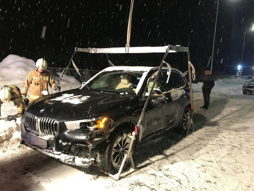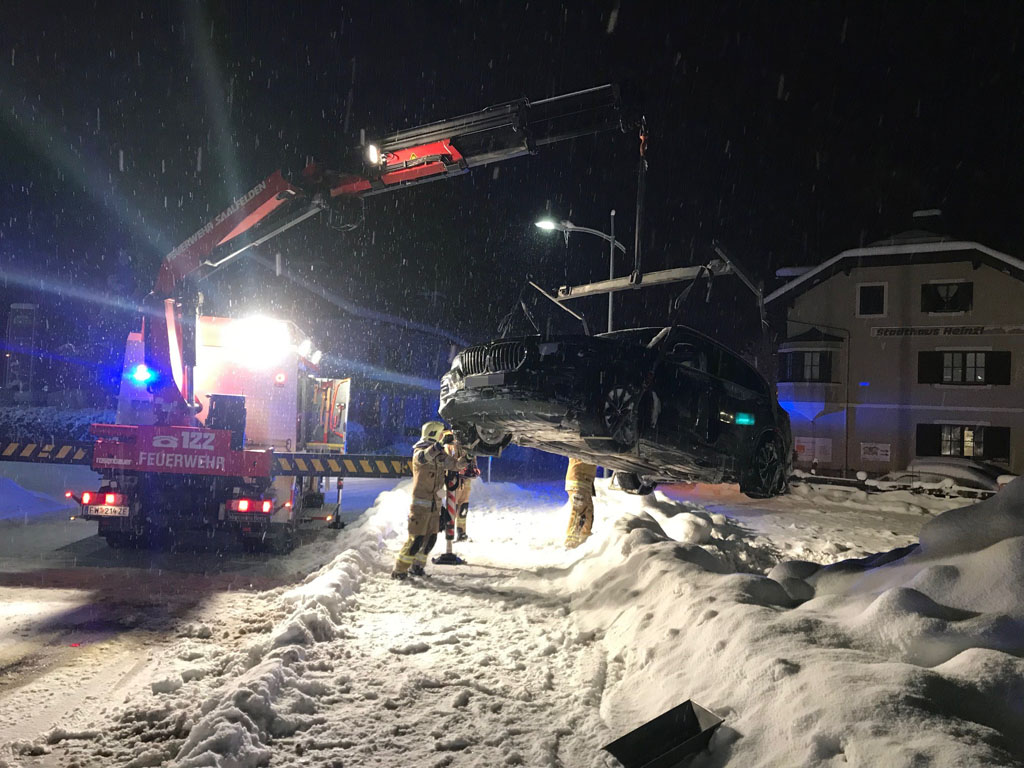 Von der Feuerwehr wurden die ausgetretenen Flüssigkeiten gebunden und das Fahrzeug mit dem Kran vom schweren Rüstfahrzeug geborgen.