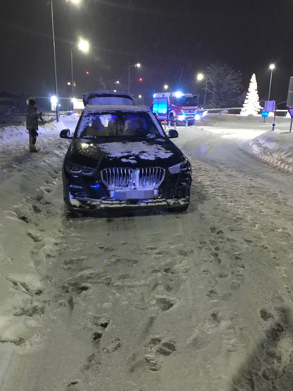 Ein PKW ist auf der verschneiten Fahrbahn über die Kreisverkehrsinsel gefahren und blieb bei einem Betonblock hängen, wodurch das Fahrzeug Ölflüssigkeit verloren hat.