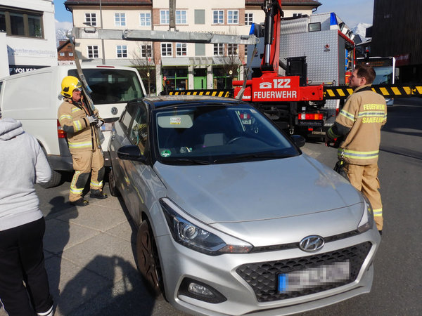 Zwei PKW sind beim Ausparken heckseitig zusammengestoßen und waren so ineinander verkeilt, dass ein Fahrzeug mittels Kran des schweren Rüstfahrzeuges angehoben werden musste.