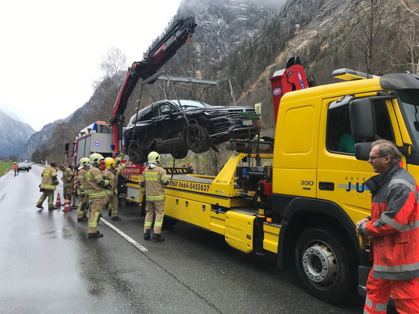 Das verunfallte Fahrzeug und der Anhänger wurden mittels dem Kran des schweren Rüstfahrzeuges geborgen.