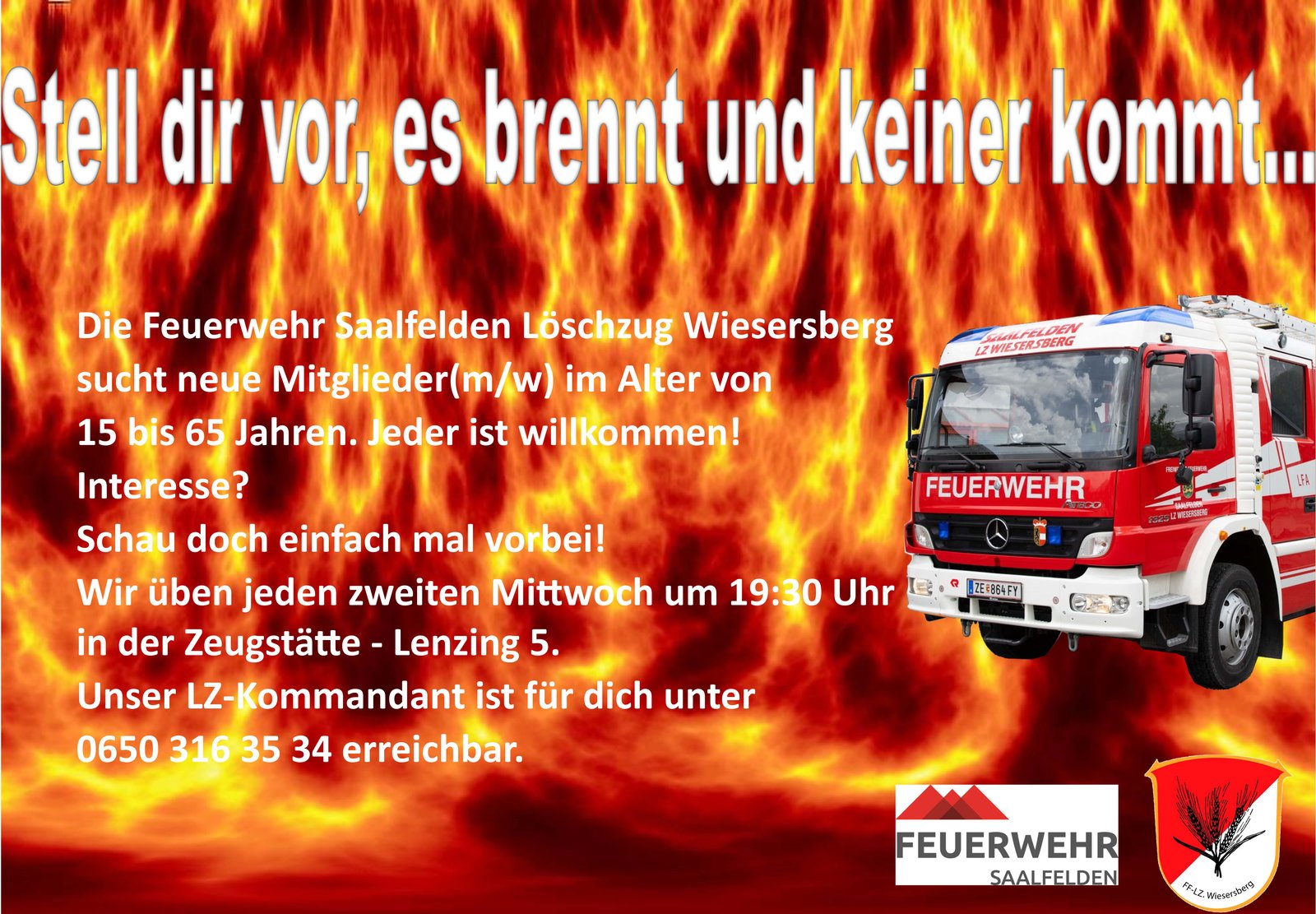 Unser LZ-Kommandant ist für dich unter 0650/316 35 34 erreichbar.
