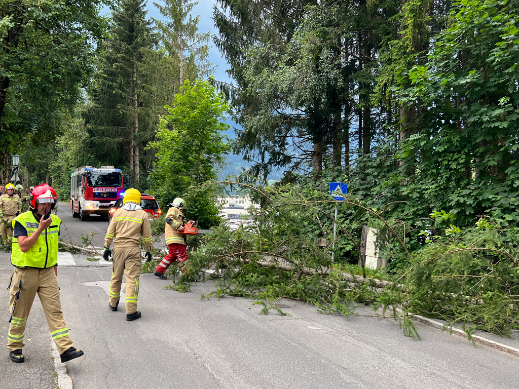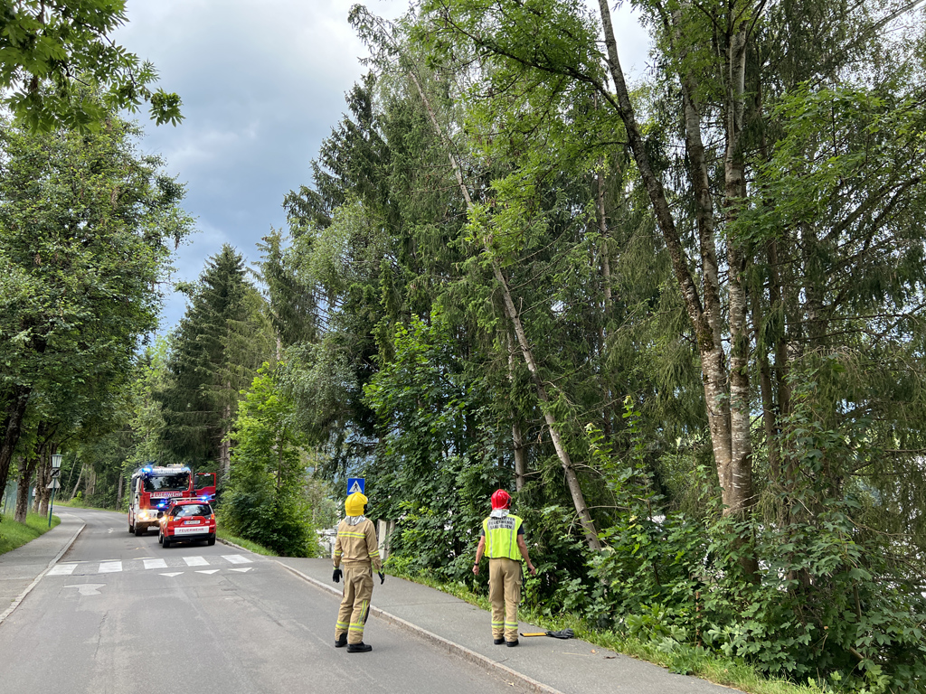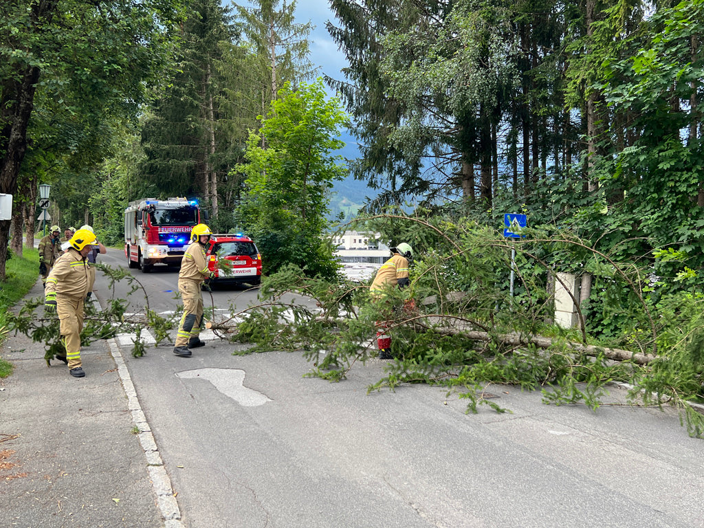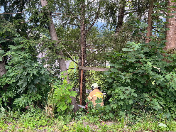 Die Feuerwehr Saalfelden wurde am 15.07.2022 um 19:10 Uhr zu einem umstürzen zu drohenden Baum in die Farmachstraße alarmiert.
