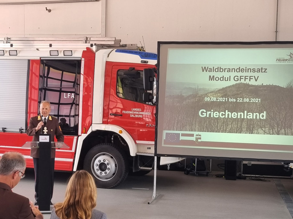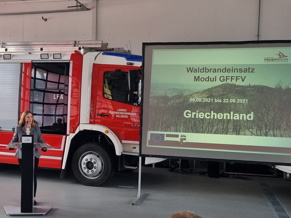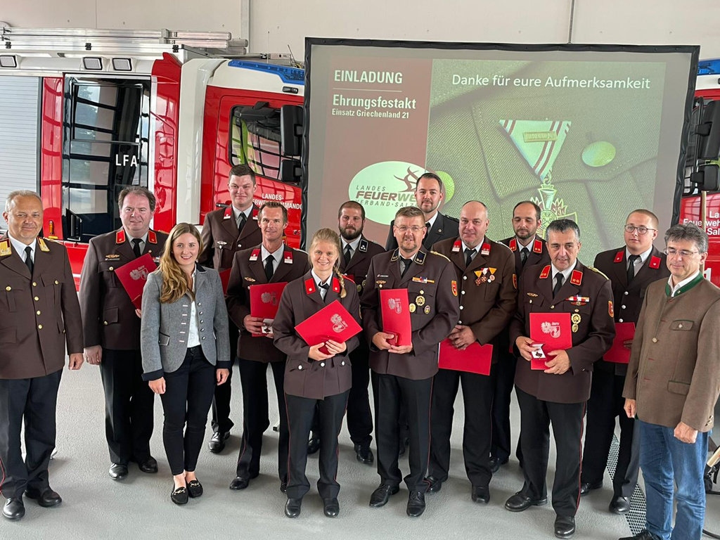 Alle eingesetzten Kamerad:innen erhielten das Katastrophen-Verdienstzeichen vom Österreichischen Bundesfeuerwerhrverband und dieses wurde von der Landtagsabgeordneten Frau Mag. Martina Jöbstl, welche stellvertretend für Herrn Landeshauptmann Dr. Haslauer anwesend war, und Herrn Landesfeuerwehrkommandant LBD Günter Trinker überreicht.