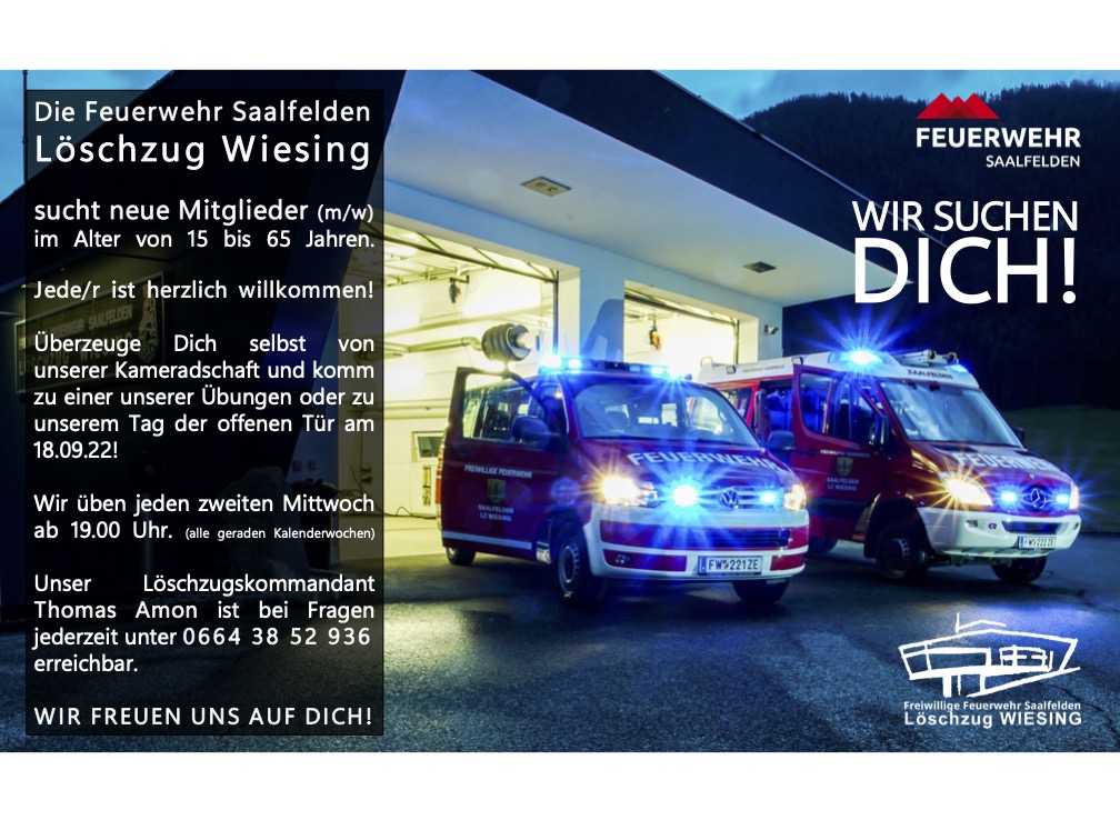 Die Feuerwehr Saalfelden Löschzug Wiesing sucht neue Mitglieder (m/w) im Alter von 15 bis 65 Jahren.