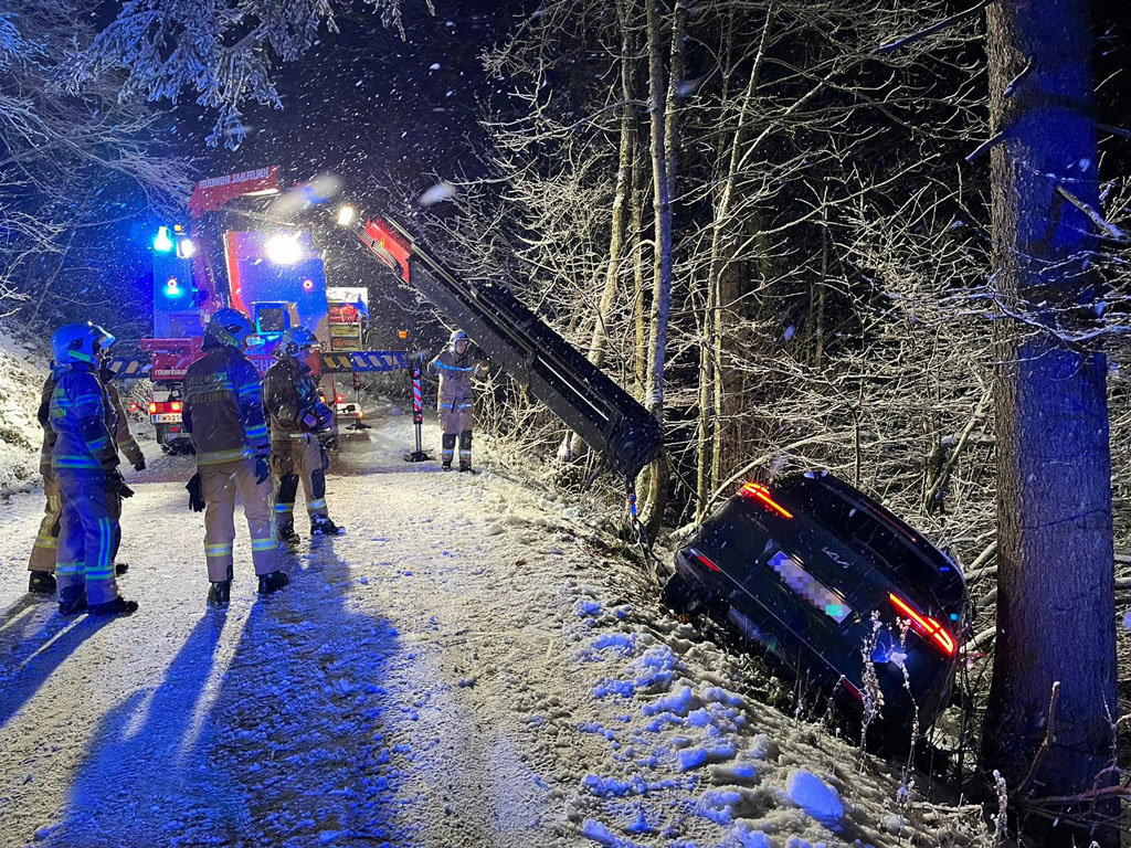 Ein Fahrzeug war auf der spiegelglatten Fahrbahn von der Straße abgekommen und drohte weiter abzurutschen.