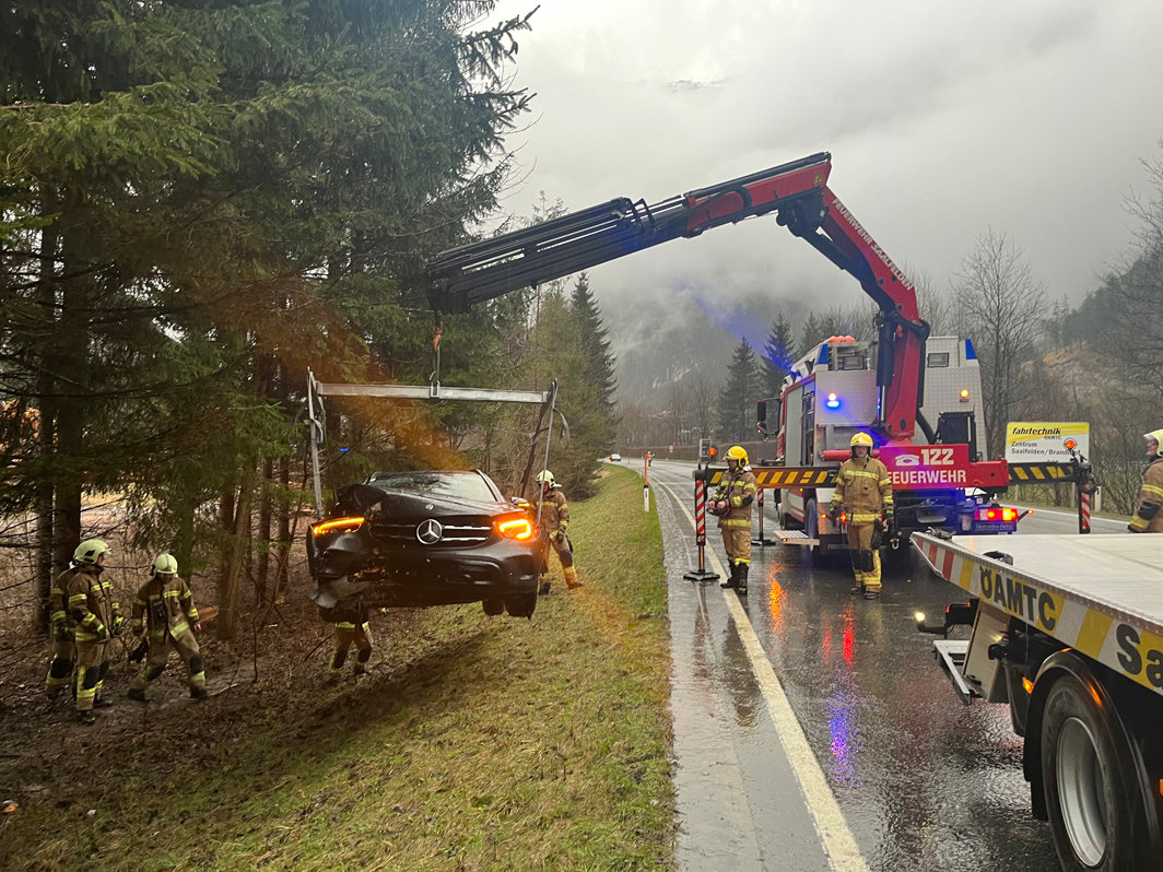 Am 30. März, gegen 17 Uhr, war ein 73-jähriger Pinzgauer mit seiner 70-jährigen Frau auf der B 311 von Lofer aus mit dem Auto in Richtung Saalfelden unterwegs, als er bei starkem Regen aus bislang unbekannter Ursache nach rechts von der Fahrbahn abkam. In weiterer Folge schlitterte das Fahrzeug etwa zwei Meter eine Böschung hinunter und touchierte zuerst mehrere kleinere Bäume, bevor es schlussendlich frontal gegen einen größeren Baum prallte und zum Stehen kam. Nachfolgende Fahrzeuglenker alarmierten die Rettungskräfte. Einsatzkräfte der Feuerwehr und des Roten Kreuzes bargen die beiden unbestimmten Grades Verletzten und führten eine Erstversorgung durch. Im Anschluss wurde die Beifahrerin mittels Rettungshubschrauber in das Krankenhaus Schwarzach und der Lenker mittels Rettungswagen in das Tauernklinikum Zell am See verbracht. Ein zuvor durchgeführter Alkomattest verlief negativ. Am Fahrzeug entstand Totalschaden.