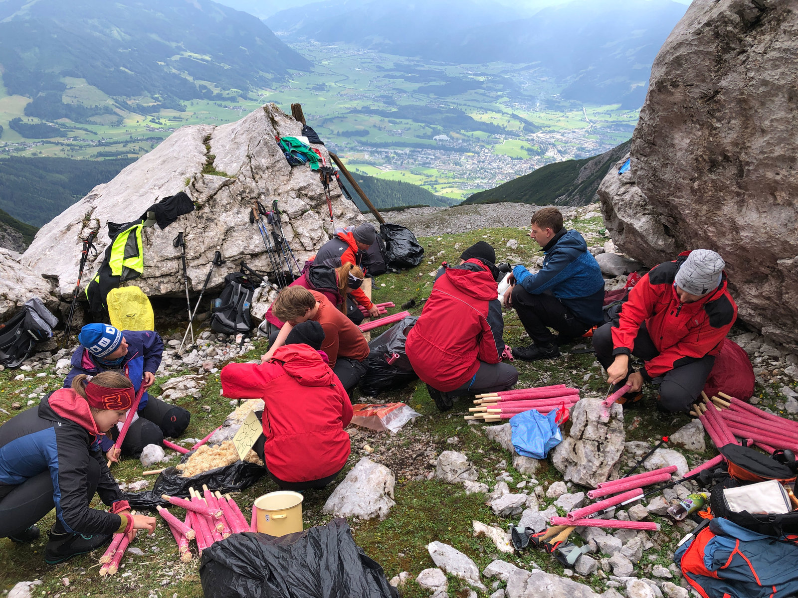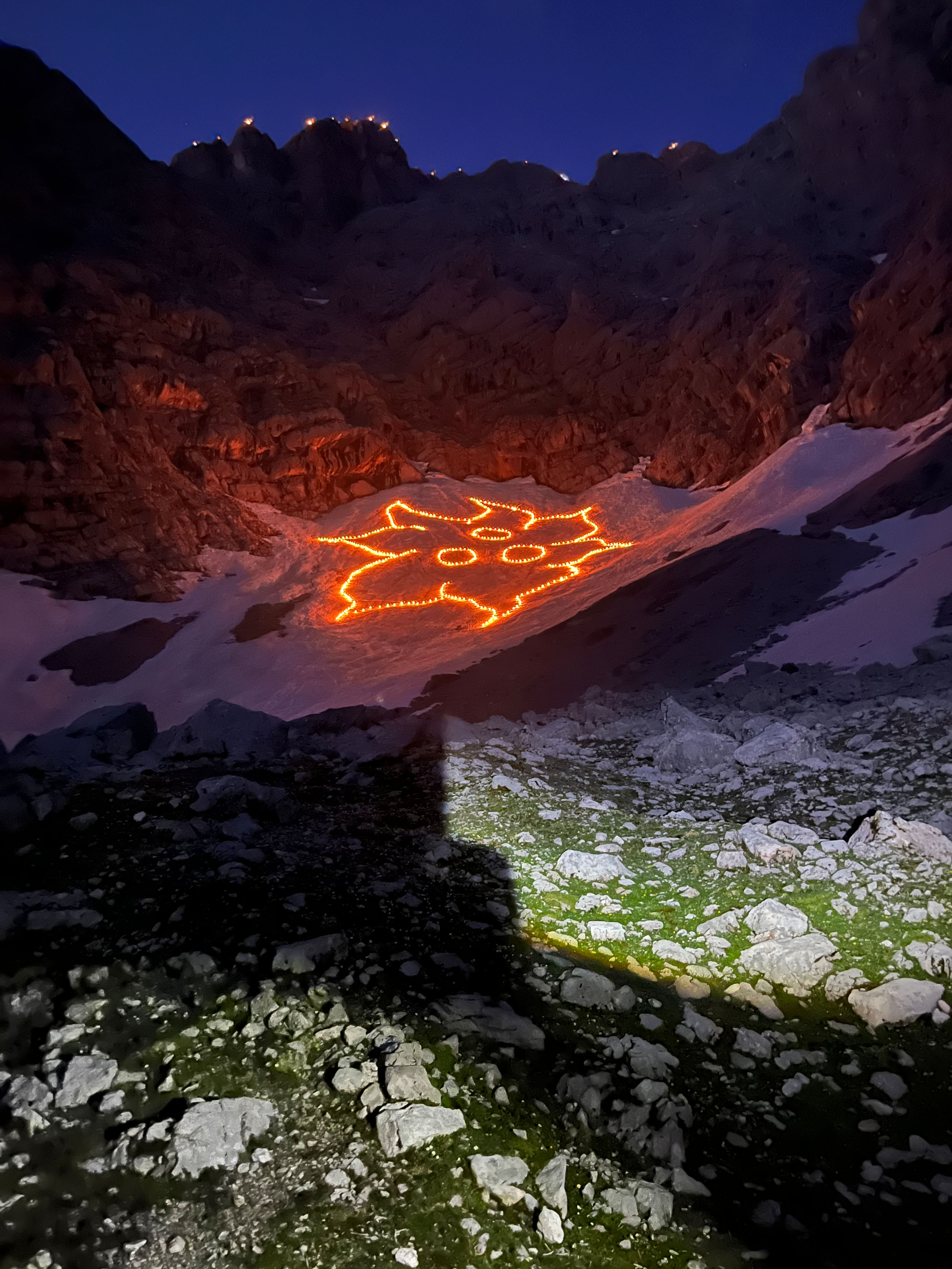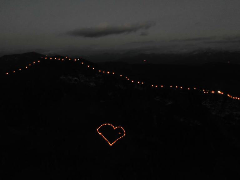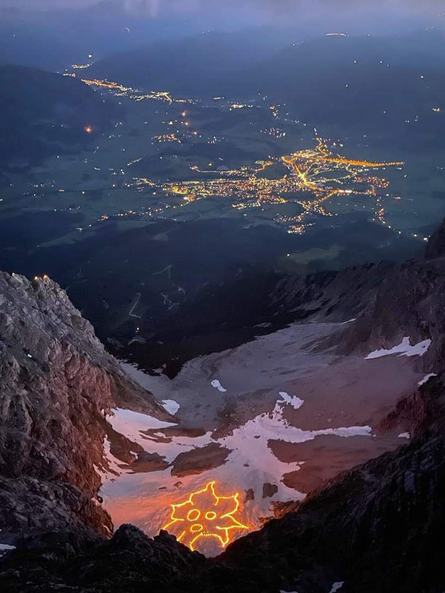 Während die Mannschaft in der Schneegrube im wahrsten Sinne des Wortes auf besseres Wetter wartete, um mit den Vorbereitungen und dem Ausstecken des Edelweißes beginnen zu können, machten sich die Kamerad:innen der Löschzüge ebenso auf in die Berge. So wanderte der LZ Harham auf die sogenannte Sausteige, um dort eine Lichterkette aus mehreren Feuern vorzubereiten. Der Löschzug Letting schmückte die Schwalbenwand mit einem brennenden Herz und einigen weiteren Feuern.