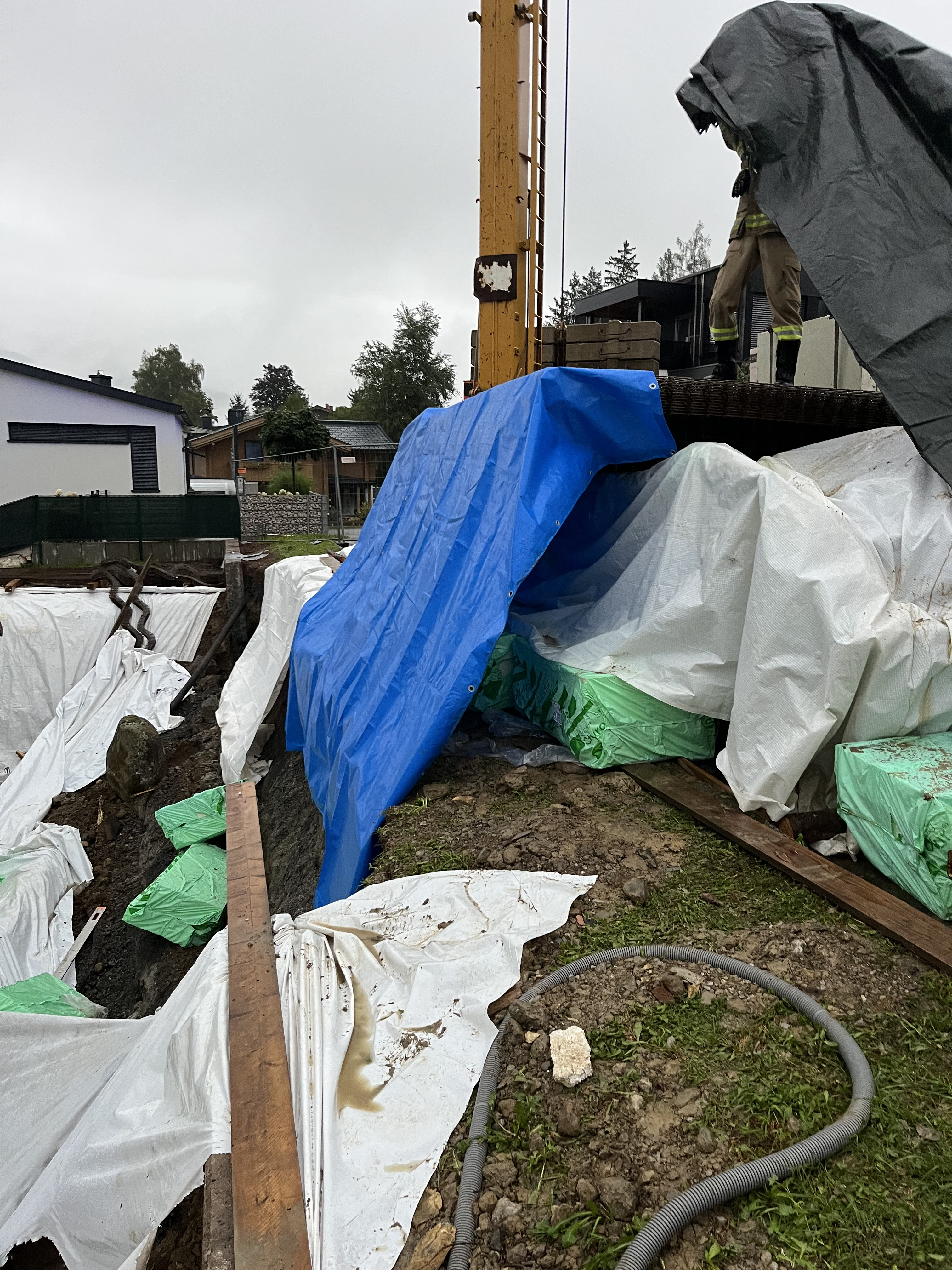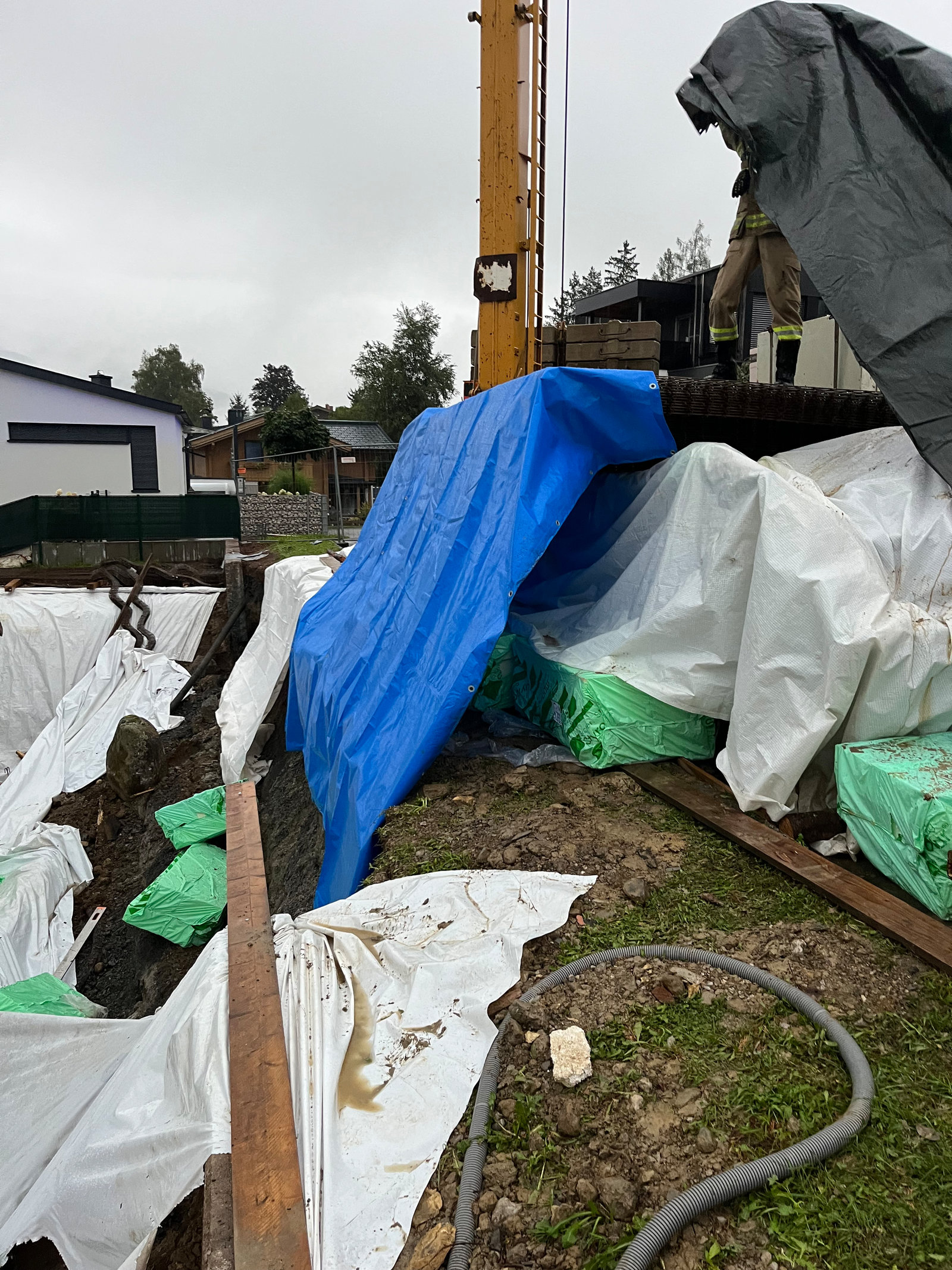Der 1. Alarm ging um 06:55 Uhr für die diensthabende Bereitschaftsgruppe ein. Ein Baukran drohte umzustürzen. Die Feuerwehr sicherte den Kran bis zum Eintreffen des Bauunternehmens und deckte den umliegenden Hang mit Planen ab um ein weiteres abrutschen zu verhindern.