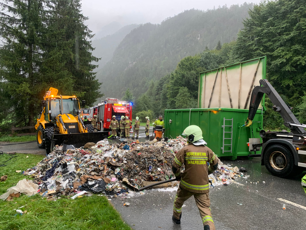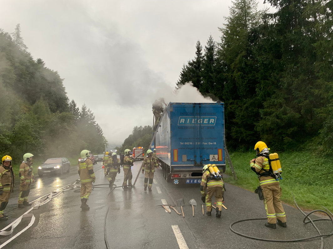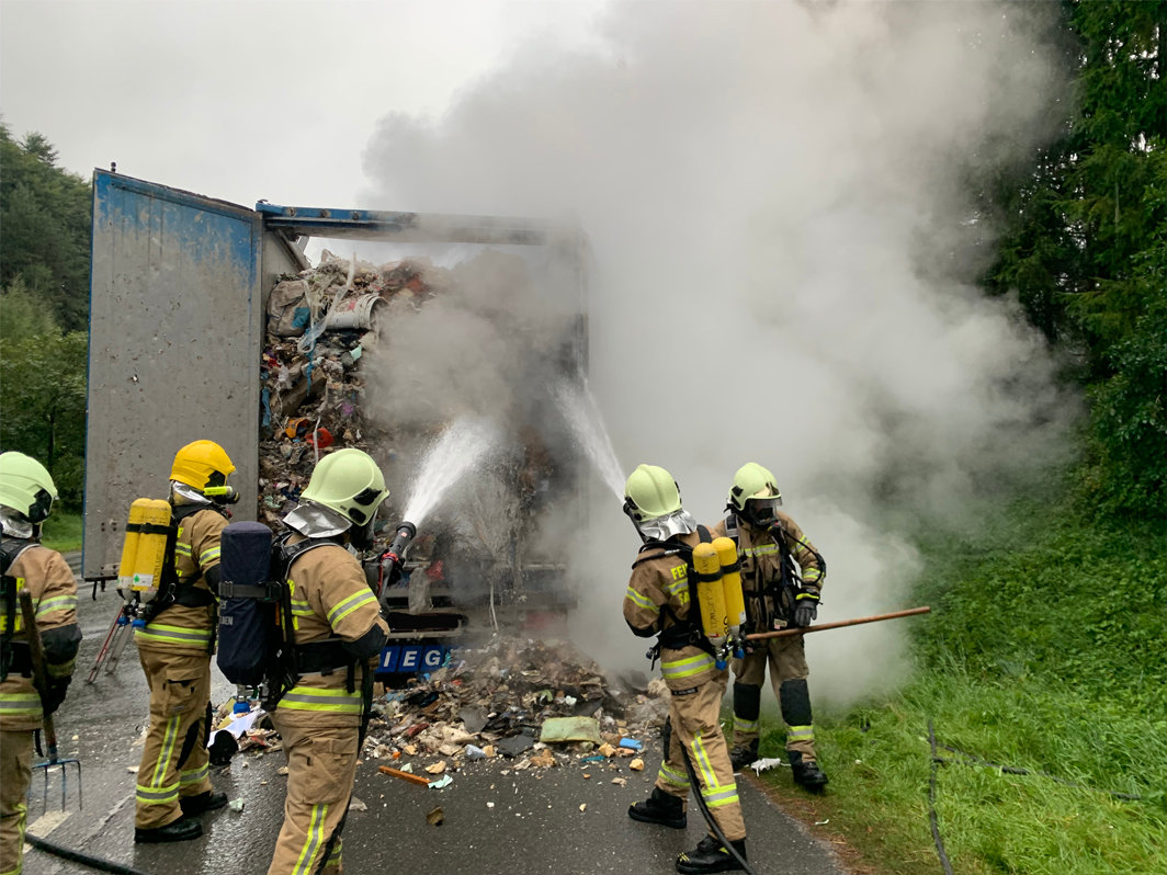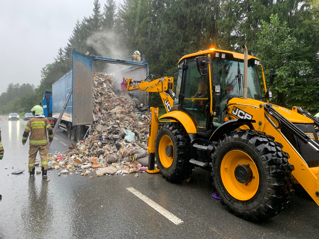 Kurz vor dem Ausrücken zur Suchaktion wurde die Hauptwache und der Löschzug Wiesing zu einem LKW-Brand auf die B311 im Bereich Fohlenhof alarmiert. Die Ladung eines mit Restmüll beladenen LKWs hatte im hinteren Teil des Sattelschleppers Feuer gefangen. Die Feuerwehr löschte den Brand unter Atemschutz ab, räumte für die Nachlöscharbeiten den Satellaufleger mittels Radlader aus und reinigte die Fahrbahn.