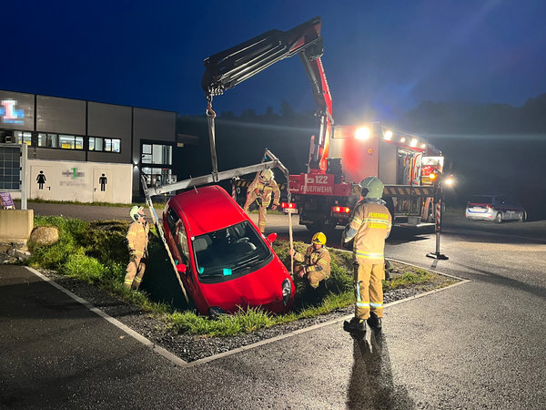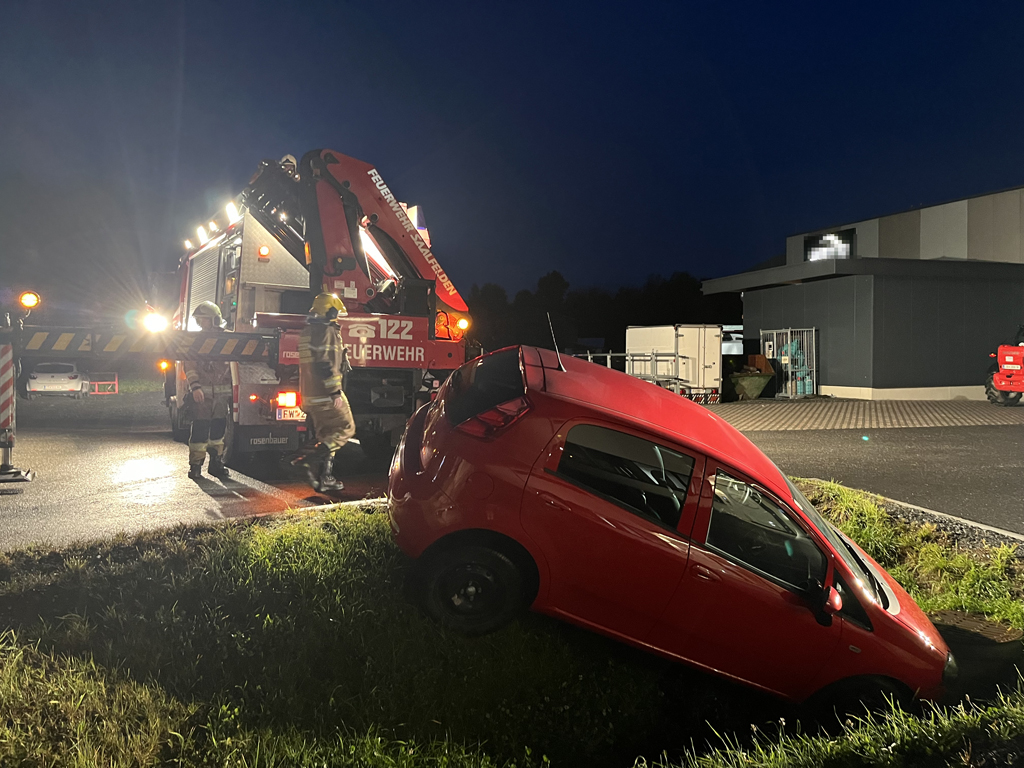 Das in einen Straßengraben geratene Fahrzeug, wurde mit dem Kran des schweren Rüstfahrzeugs geborgen.