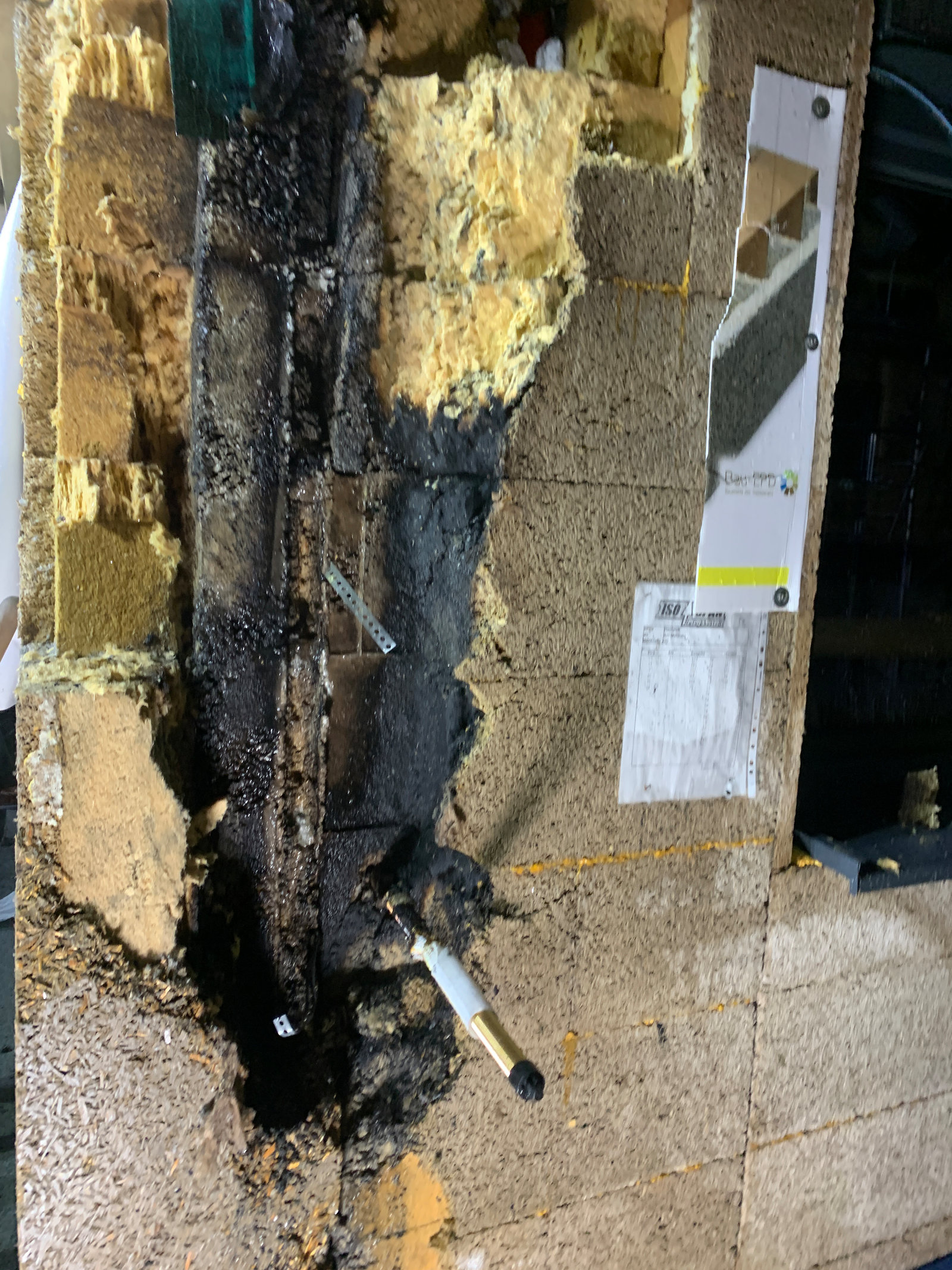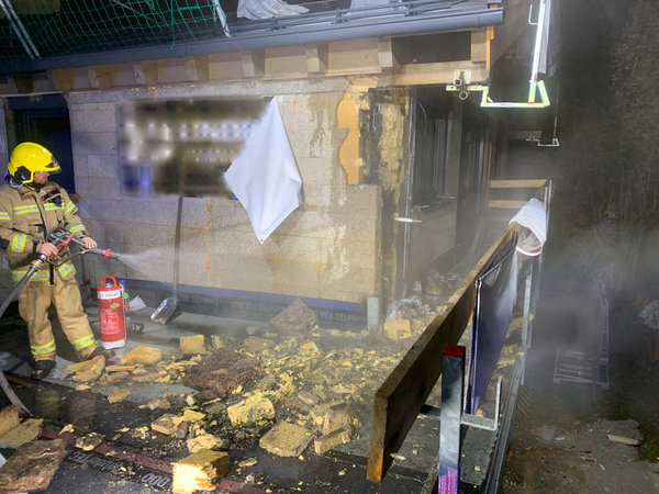 An einer Hausfassade war ein Glimmbrand entstanden. Die Feuerwehr öffnete den betroffenen Bereich, löschte den Brand ab und kontrollierte die Fassade anschließend mittels Wärmebildkamera auf weitere Wärmequellen.