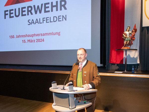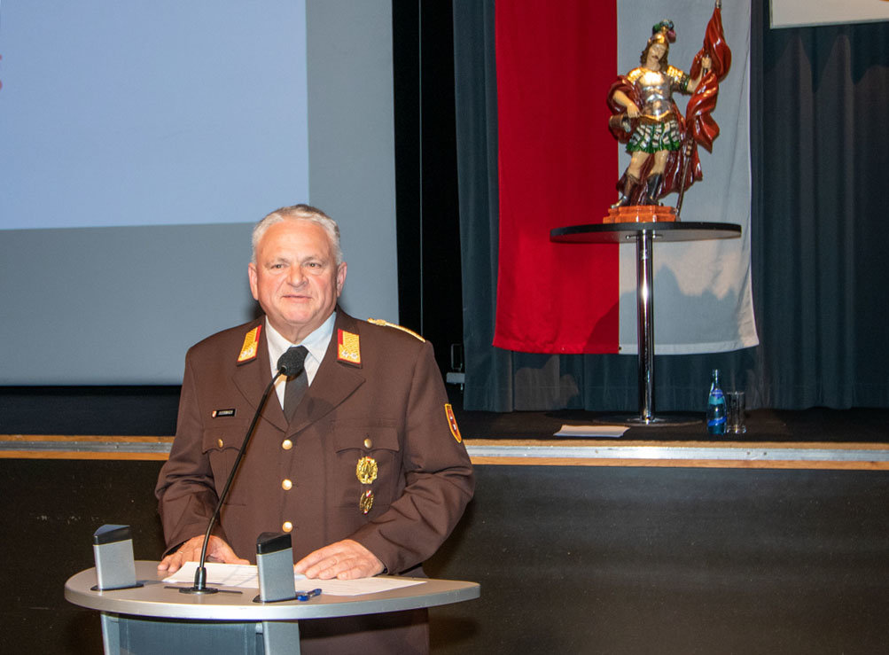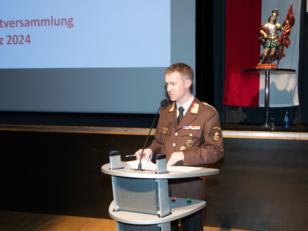Bei seiner Ansprache bedankte sich OFK Thomas Schreder bei 234 aktiven Mitgliedern für 45.416 geleistete Stunden und für die Ausrückungen bei 524 Einsätzen im Jahr 2023.
