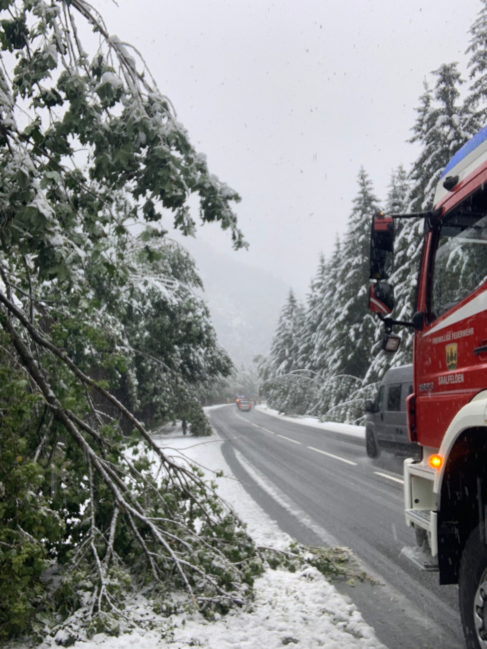 Am 14.09.2024 musste die Feuerwehr Saalfelden Hauptwache sowie der Löschzug Wiesing mehrere Unwettereinsätze abarbeiten. Durch den starken Schneefall mussten mehrere Bäume entlang der B311 beseitigt werden.