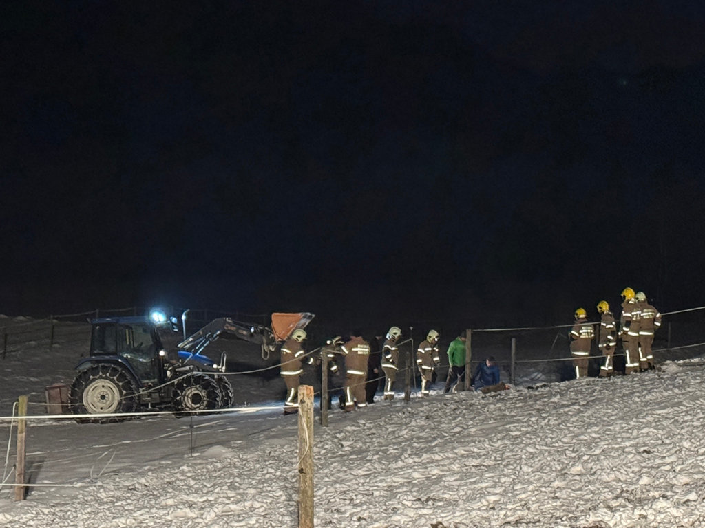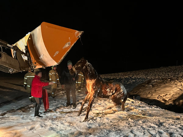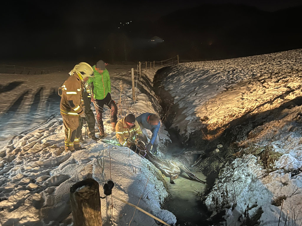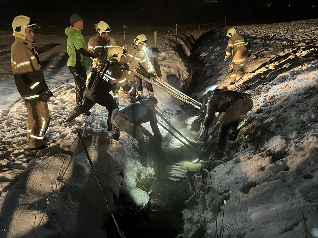Ein junges Pferd war in ein Gerinne gestürzt und wurde, im Beisein eines Tierarztes, mit Hilfe der Kräfte der Feuerwehr Saalfelden aus dem Gerinne gerettet.