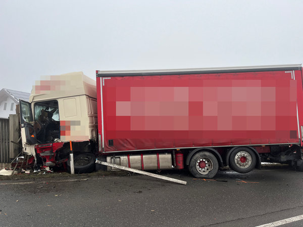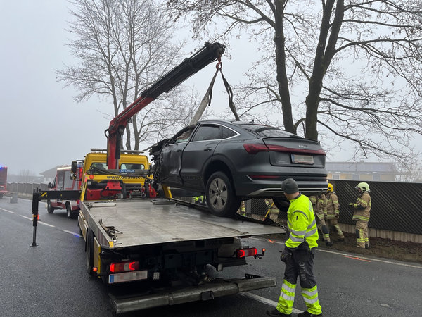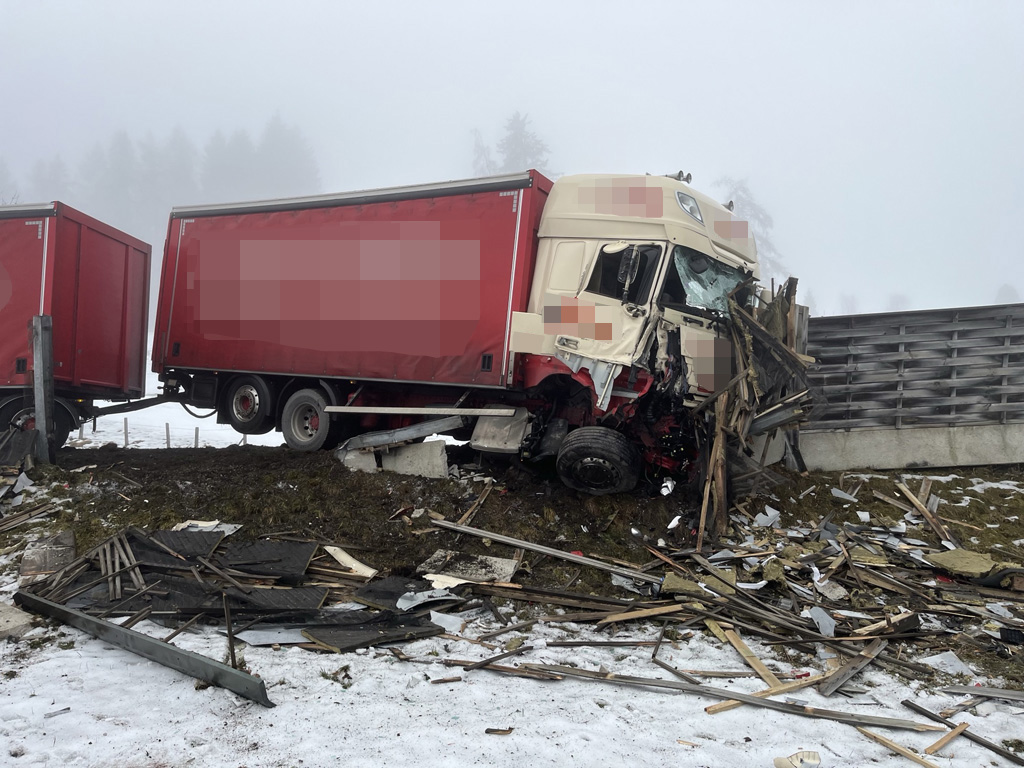 Ein PKW und ein LKW sind frontal zusammengestoßen. Der LKW ist daraufhin von der Straße abgekommen und mit der Lärmschutzwand kollidiert.
