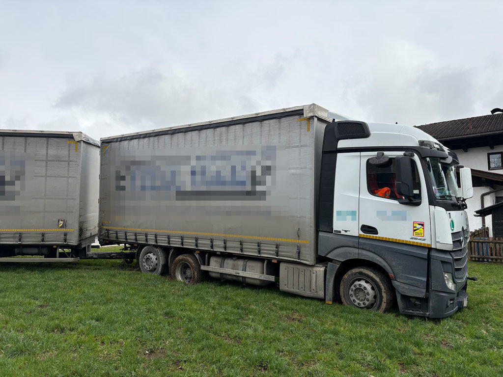 Ein Lkw war versehentlich in ein unbefestigtes bzw. nicht für schwere Nutzfahrzeuge geeignetes Terrain geraten, was zu einer eingeschränkten Beweglichkeit und Festsetzung des Fahrzeugs führte.