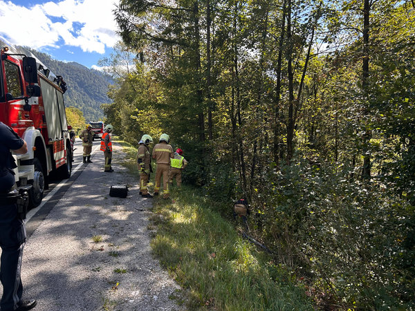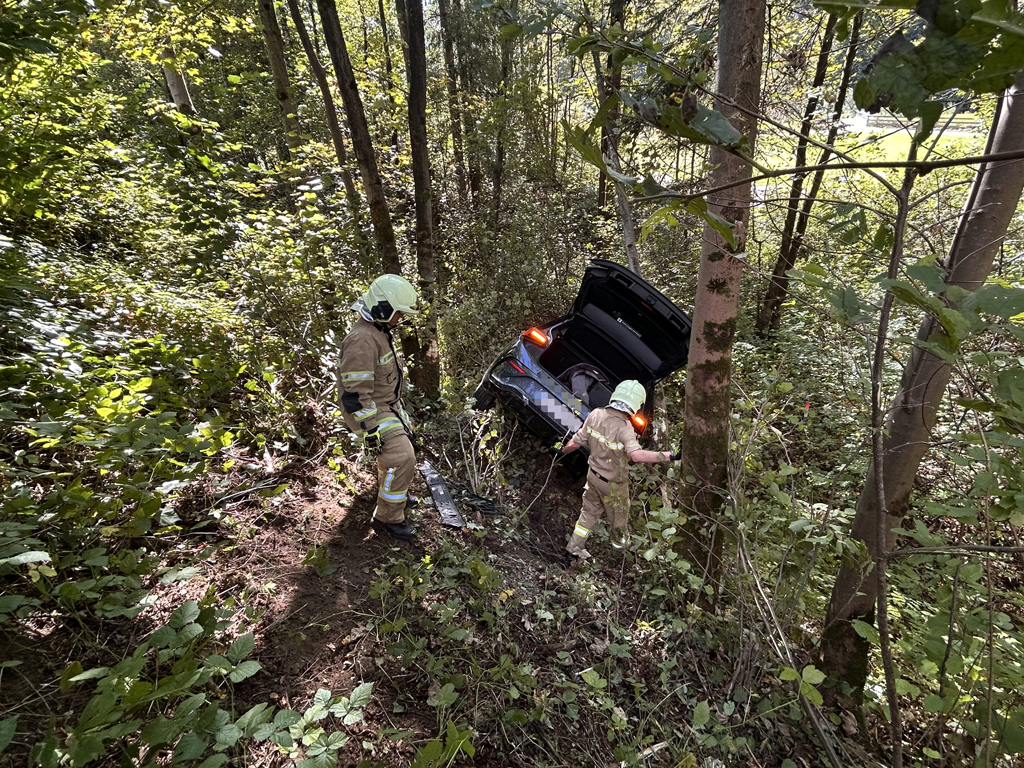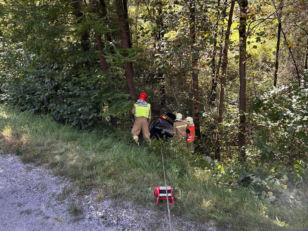 Ein Fahrzeug war von der Straße abgekommen und ist ca. 15m entfernt zwischen Bäumen hängen geblieben. Der Fahrer wurde bereits vom Roten Kreuz betreut.