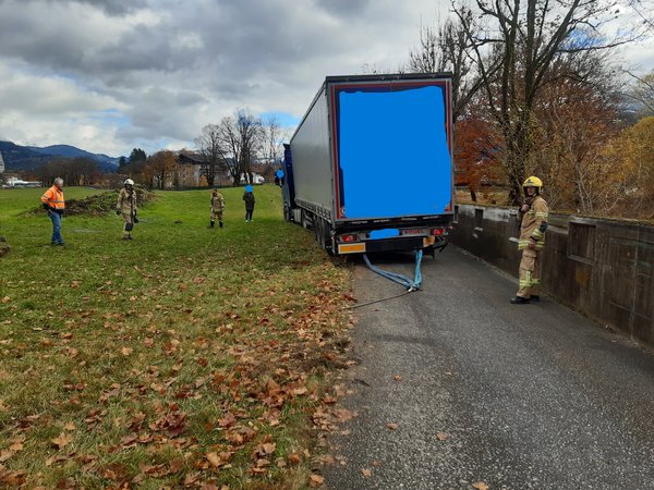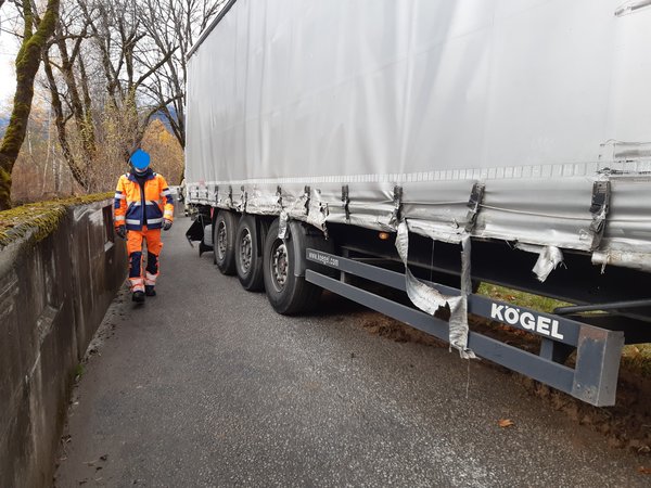 Die Bereitschaften 2 und 3 der Feuerwehr Saalfelden wurden am 03.11.2025 um 11:51 von der Polizei zu einer LKW-Bergung im Bereich Dorfheim alarmiert. Ein Sattelzug hatte sich auf dem Radweg festgefahren und dabei einen Zaun, ein Fahrzeug sowie mehrere Laternen und Verkehrszeichen beschädigt.