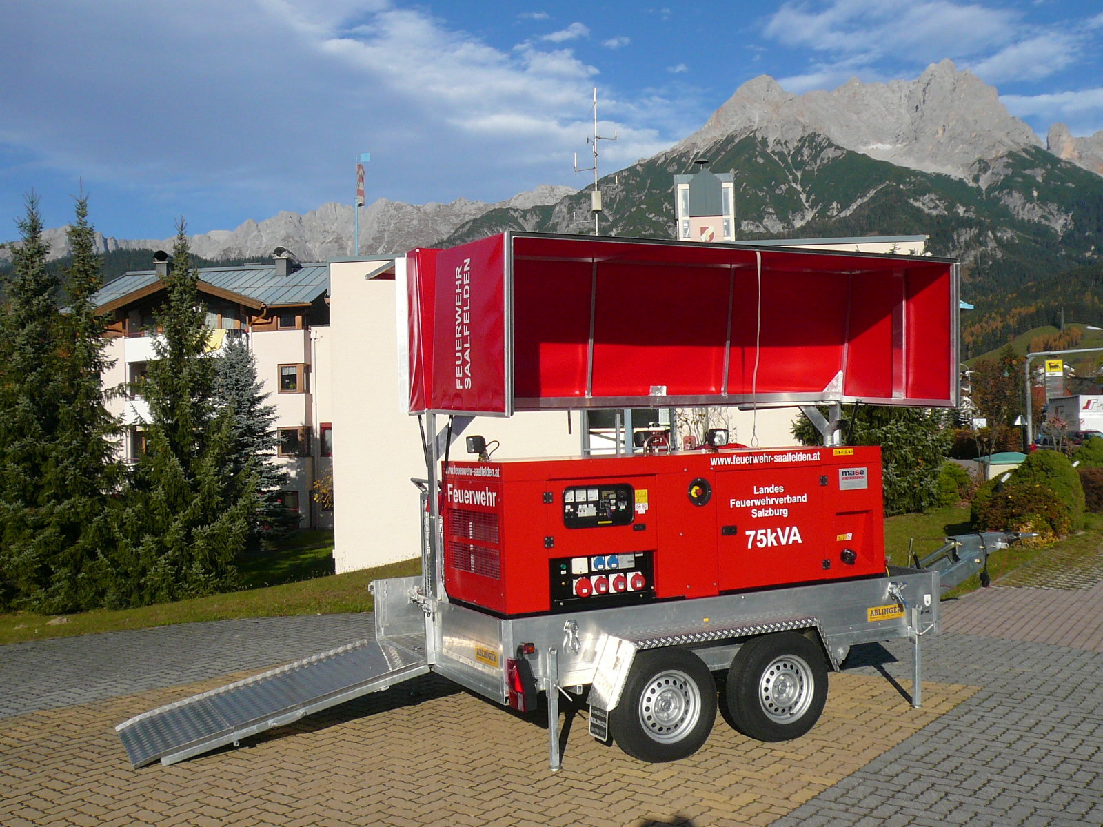 | Der Hochwasseranhänger (HOWA) des Bezirkes Pinzgau ist in Saalfelden stationiert. Ausrüstung: 3 Elektrotauchpumpen (je 3000l/min) 1 Schlammpumpe - Korngröße 80mm (2500l/min) 1 Stromerzeuger 75 KVA inkl. Schlauchzubehör Eigentümer: Landesfeuerwehrverband-Salzburg |