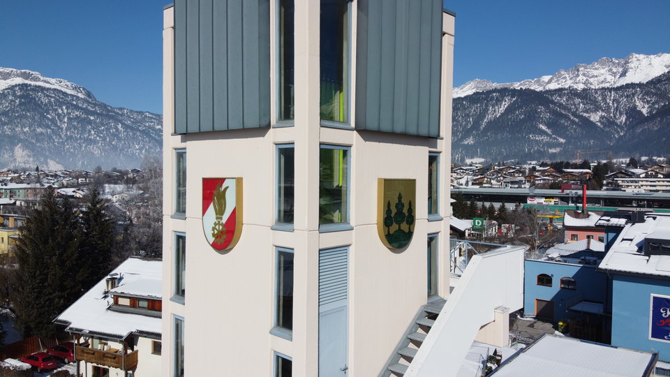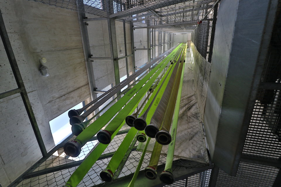 Im Turminneren werden die Schläuche nach der Reinigung und Überprüfung zum Trocknen aufgehängt.